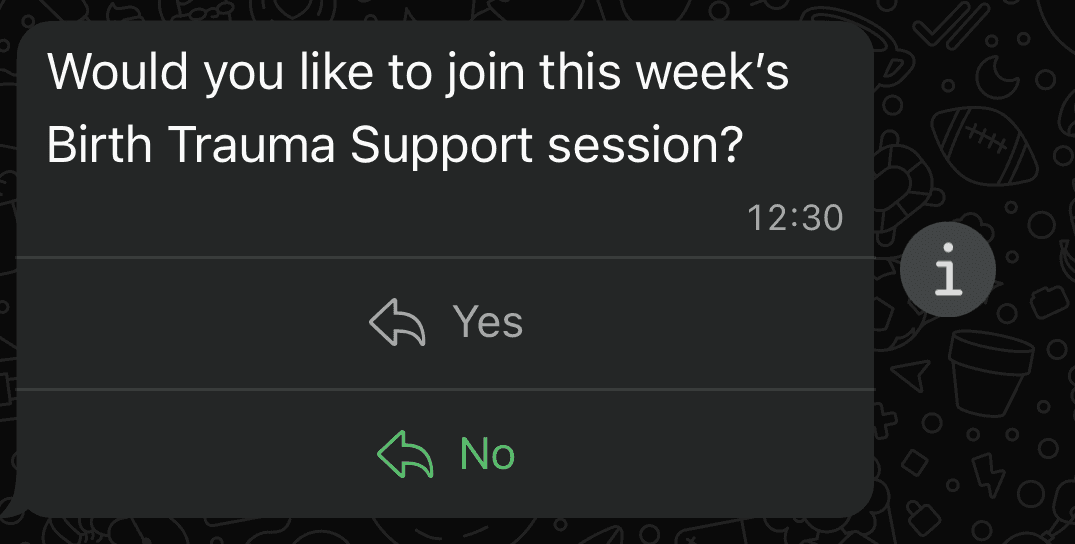 Join an expertly facilitated, text-based support session with a group of women processing a difficult birth. Easy to join over WhatsApp. Safety layer added.